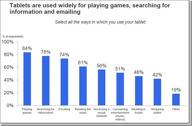 報告的統計結果,呈現的消費習慣是,下班後、在家裡使用,假日比較少帶出去玩,以玩遊戲、搜尋資料、閱讀、email、社群活動、聲光娛樂及購物為主,這些都是可以消磨下班後短暫的休閒時光。